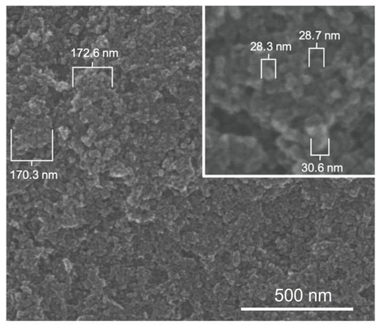Scanning electron micrographs of E1800 (solvent casting method) showing primary carbon nanoparticles approximately 29 nm in diameter (inset) and aggregates of approximately 170 nm formed by primary particles.