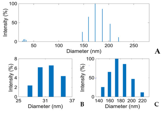 (A) Dynamic Light Scattering (DLS) analysis showing two distinct peaks (~32 nm and ~170 nm) in E1800 suspension (1 mg/mL). Mean particle diameter was 169.8 nm with a relative variance of 0.049 and a root mean squared error of 3.2 × 10−2. Panels (B,C) respectively show zoomed in views of the particle size (25–37 nm) and aggregate size (140–220 nm) distributions from the DLS analysis in panel (A). Note that larger particles/aggregates scatter light more effectively than smaller particles. Thus, the exact quantitative proportions of the various particles and aggregates cannot be determined from DLS intensity.