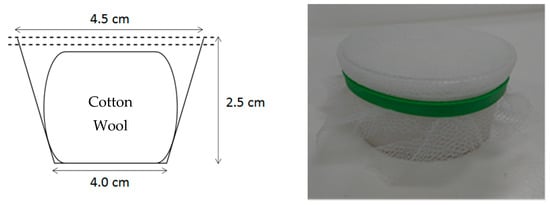 Sugar feeder made from a plastic pot of 2.5 cm height, large radius of 4.5 cm, and small radius of 4 cm. A wad of cotton wool was pressed into the pot to be just below the upper lip without touching the netting (judged by eye) and soaked in sugar solution into which the required concentration of insecticide was dissolved. A double layer of netting was stretched across the top and secured using an elastic band.