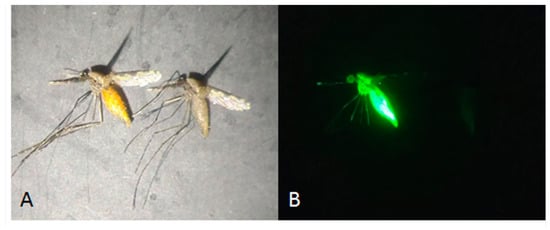 After the exposure period, all mosquitoes were aspirated out of each cage into holding cups, separated by treatment as well as living or dead, then frozen at −20 °C. Once mosquitoes were killed (usually 1–2 h at freezing temperatures), they were scored for fluorescence using a Leica MZ 10 F microscope (Leica Microsystems, Milton Keynes, UK) under a yellow-fluorescent protein (YFP) filter (Figure 2). Only those mosquitoes that were scored as being positive for feeding by fluorescence were included in the mortality calculations. Feeding rate was calculated for each replicate test from the proportion of fluorescent positive mosquitoes relative to all exposed mosquitoes. All raw bioassay data is available in Supplementary Materials.