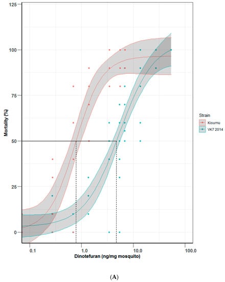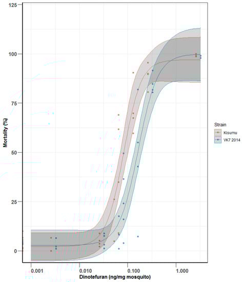 Mortality comparison between Kisumu and VK7 strains when fed on sugar solution spiked with dinotefuran at known concentrations, resulting in doses of dinotefuran in nanograms per milligram of mosquito. Central lines of each curve represent the dose response of each species. Black lines indicate LD50 values; red refers to the mortality curve of Kisumu; blue refers to the mortality curve of VK7 2014. The shaded areas of each curve represent 95% CI values, generated by R software using the ggplot2 package [13].