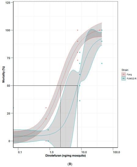 Because of the practical challenges in performing ingestion assays, particularly in field settings and at high throughput, dose response curves were also plotted using topically applied dinotefuran in two pairs of Anopheles strains as a comparator to the ingestion assay. Topical bioassays (Figure 4A,B) for Kisumu generated an LD50 value of 0.75 (0.55–1.03) ng of dinotefuran per mg of mosquito and VK7 2014 assays generated an LD50 value of 5.34 (3.97–7.19) ng of dinotefuran per mg of mosquito; together this gives a resistance ratio of 7.12. LD50 values for Fang and FUMOZ-R were 2.31 (1.63–3.27) and 7.47 (5.98–9.32) ng of dinotefuran per mg of mosquito, respectively, resulting in a resistance ratio of 3.23. Lethal doses (LD50 and LD95) by topical application are shown in Table 2.