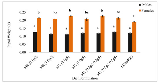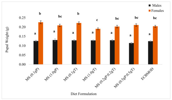 There were no significant differences observed in male pupal weights produced from the diet formulations (weight: 0.13 ± 0.00 g [n = 30]; p = 0.054), and these were significantly lighter than female pupae. However, there were significant differences in female pupal weights between diet formulations. The weight of female pupae produced from the MS (0.1 gP) (weight: 0.23 ± 0.01 g [n = 30]; p = 0.002) and MS (0.1 gT) (weight: 0.22 ± 0.01 g [n = 30]; p = 0.009) diets were not significantly different, but they were significantly heavier than those from the MS (1.0 gT) diet (Figure 2).