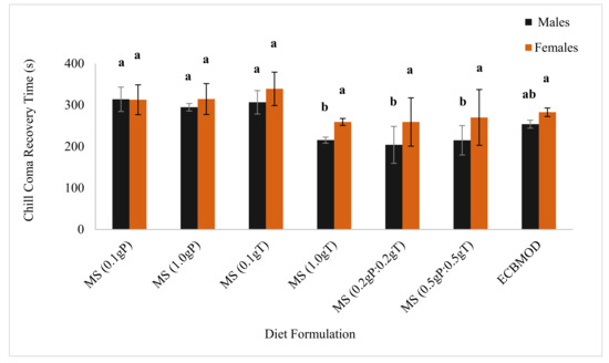 Mean (±SE) chill coma recovery time of Eldana saccharina male and female moths [n = 30] from the MS (0.1 gP), MS (1.0 gP), MS (0.1 gT), MS (1.0 gT), MS (0.2 gP:0.2 gT), MS (0.5 gP:0.5 gT) and ECBMOD control diets. Different lower-case letters above the graph histogram bars indicate that mean differences are significant at the 0.05 level.