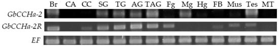 RT-PCR analyses of the tissue distributions of GbCCHa-2 and -2R in male eighth-instar nymphs. Elongation factor (EF) was used as the internal control gene. No-RT negative control and no-template control yielded no amplification products (Supplementary Materials, Figure S1). Br, brain; CA, corpora allata; CC, corpora cardiaca; SG, subesophageal ganglion; TG, thoracic ganglia; AG, abdominal ganglia; TAG, terminal abdominal ganglion; Fg, foregut; Mg, midgut; Hg, hindgut; FB, fat body; Mus, muscle; Tes, testis; MT, Malpighian tubules.