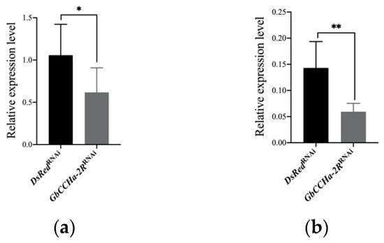 RNAi efficiency. The relative mRNA levels of GbCCHa-2R in CNS (a) and gut (b) on the third day after dsRNA injection. ß-actin was used as the reference gene. Values are shown as mean + S.D., n = 5–9, * p < 0.05, ** p < 0.01, unpaired t-test.