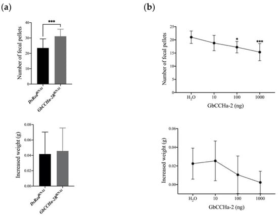 In D. melanogaster, it has been reported that DmCCHa-2 mutants show retarded development and decreased body size, whereas little influences in growth were observed in crickets treated with dsGbCCHa-2R or GbCCHa-2 peptide (Figure 3b). On the other hand, increased weight was observed only on the third day during the RNAi experiment and for the first 12 h during the peptide-treatment experiment; therefore, differences in growth rate cannot be reflected during such a short experimental period. In addition, as development and growth may be highly plastic, the growth abnormality caused by excessive or insufficient food consumption might be rescued by adjusting the efficiency of uptake of nutrients from the consumed and ingested food [36,37].