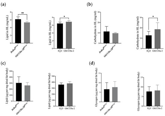 As the alteration in feeding is generally associated with a shift in the metabolic state, we measured the lipid and carbohydrate levels in the hemolymph and fat body of GbCCHa-2R-knockdown crickets. The concentration of hemolymph lipids in dsGbCCHa-2R-treated crickets was significantly lower than that in the control group. In contrast, GbCCHa-2 injection increased the lipid concentration in the hemolymph (Figure 4a). No alteration was observed in the carbohydrate level in the hemolymph by GbCCHa-2R knockdown compared to that in the control, whereas an increased level was observed in GbCCHa-2-applied crickets (Figure 4b). The levels of stored lipids and glycogen in fat body were not changed after either treatment (Figure 4c,d).