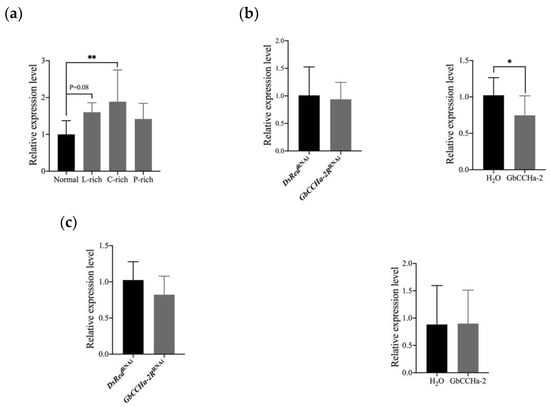 Effects of dietary nutrients on GbCCHa-2R and effects of GbCCHa-2 signaling on Gbilp and GbAKH: (a) The transcript levels of GbCCHa-2R in the crickets fed on normal diet or lipid-, carbohydrate-, and protein-rich diet (L-, C-, and P-rich); (b) The transcript levels of Gbilp in CNS after GbCCHa-2R knockdown and GbCCHa-2 administration; (c) The transcript levels of GbAKH in CNS. Values are showed as mean + S.D., n = 6–9, * p < 0.05, ** p < 0.01, one-way ANOVA with post hoc Dunnett’s test for (a), unpaired t-test for (b,c).
