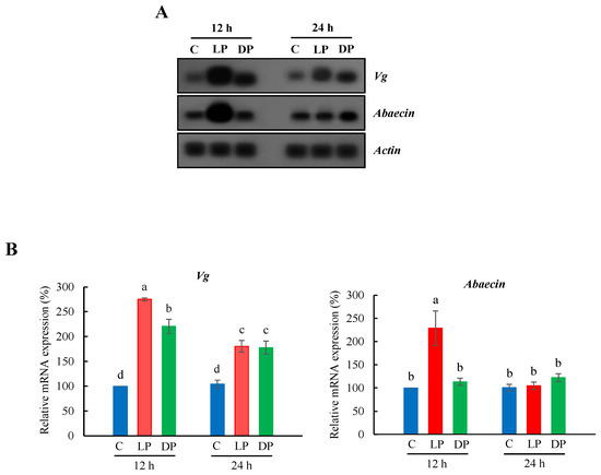 Expression profile of Vg and abaecin in the fat body of A. mellifera nurse bees fed with live or heat-killed P. larvae. (A) The expression of Vg and abaecin, as ascertained by northern blot analysis (n = 7). β-Actin was used as an internal control to depict the total RNA loading amount. C, untreated controls; LP, feeding with live P. larvae; DP, feeding with heat-killed P. larvae. 12 h and 24 h represent feeding time. (B) The relative levels of Vg and abaecin mRNAs represent the average band densities of the target genes normalized to the expression levels of the control (12 h). The bars represent the mean ± SD from three measurements. A one-way ANOVA test was used to determine the significant difference (p < 0.05) with different lowercase letters (a–d).