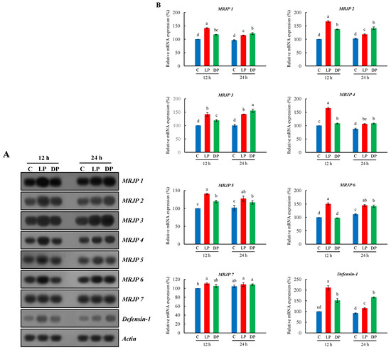 Expression profile of MRJPs 1–7 and defensin-1 in hypopharyngeal glands of A. mellifera nurse bees fed with live or heat-killed P. larvae. (A) The expression of MRJPs 1–7 and defensin-1, as ascertained by northern blot analysis (n = 7). β-Actin was used as an internal control to depict the total RNA loading amount. C, untreated controls; LP, feeding with live P. larvae; DP, feeding with heat-killed P. larvae. 12 h and 24 h represent feeding time. (B) The relative levels of MRJPs 1–7 and defensin-1 mRNAs represent the average band densities of the target genes normalized to the expression levels of the controls (12 h). The bars represent the mean ± SD from three measurements. A one-way ANOVA test was used to determine the significant difference (p < 0.05) with different lowercase letters (a–d).