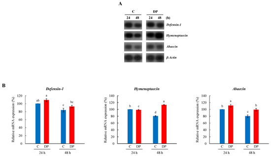 Expression profile of defensin-1, hymenoptaecin, and abaecin in the whole body of A. mellifera young larvae fed with heat-killed P. larvae. (A) The expression of defensin-1, hymenoptaecin, and abaecin, as ascertained by northern blot analysis (n = 9). β-Actin was used as an internal control to depict the total RNA loading amount. C, untreated controls; DP, feeding with heat-killed P. larvae. 24 h and 48 h represent feeding time. (B) The relative levels of defensin-1, hymenoptaecin, and abaecin mRNAs represent the average band densities of the target genes normalized to the expression levels of the control (24 h). The bars represent the mean ± SD from three measurements. A one-way ANOVA test was used to determine the significant difference (p < 0.05) with different lowercase letters (a–d).
