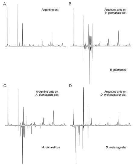 Mirror diagrams of cuticular hydrocarbon profiles from the dietary experiment. Upper profiles in each panel show cuticular hydrocarbon profiles of Argentine ants fed each type of insect diet; lower profiles are of the insect prey items themselves. (A) Unmanipulated Argentine ants, (B) Blatella germanica-fed Argentine ants (top) and B. germanica (bottom), (C) Acheta domesticus-fed Argentine ants (top) and A. domesticus (bottom), (D) Drosophila melanogaster-fed Argentine ants (top) and D. melanogaster (bottom).