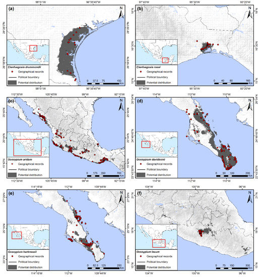 - Phillips, S.J.; Anderson, R.P.; Schapire, R.E. Maximum entropy modeling of species geographic distributions. Ecol. Model. 2006, 190, 231–259. [Google Scholar] [CrossRef]