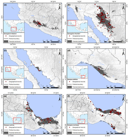 - Jones, R.W.; Cruz-Torres, M.F.; López-González, C.; Duarte-Fernández, M.A. Conservation status the genus Hampea (Malvaceae: Gossypieae) in Mexico. Bot. Sci. 2018, 96, 426–442. [Google Scholar] [CrossRef]