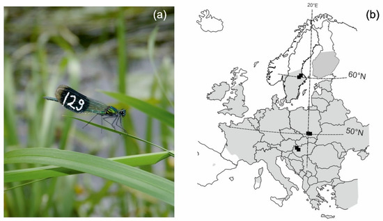 Calopteryx splendens (Figure 1a) is a common Eurasian damselfly, inhabiting lowland rivers and slow-flowing streams. Its European latitudinal range extends from northern Scandinavia to the coast of the Mediterranean Sea. Hence, the species experiences a major latitudinal gradient in ambient temperatures and breeding season length [31]. The species exhibits strong site fidelity [32] and displays a wide range of sexual and territorial behaviours. Males adopt either territorial or non-territorial strategies, and territorial males fight with conspecifics to gain access to a territory (i.e., patch of floating vegetation). Once a male obtains a territory, he starts to defend it by patrolling along its ranges and chasing away any intruders approaching the area [33]. Patrol flight of a territorial male is a rapid circular flight along the borders of his territory [34,35]. Non-territorials either patrol over the larger sections of a river, with no particular attachment to one place, or can exhibit satellite tactics, i.e., when a male focuses on a selected area but does not own a territory and hence does not defend it [33]. Once a female approaches a territory, the territorial male starts to court her by showing his territory quality (i.e., patrol flights and so-called dive display, that is, alighting on the water surface for a few seconds) and changing wing-beating frequency [36,37,38].