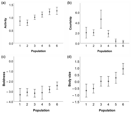 Means and 95% confidence intervals of activity (a), courtship (b), boldness (c), and body size (d) of Calopteryx splendens between six populations: 1-2 (southern region), 3-4 (central region), and 5-6 (northern region).