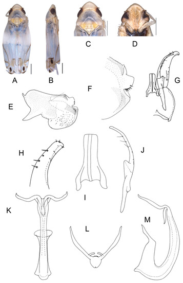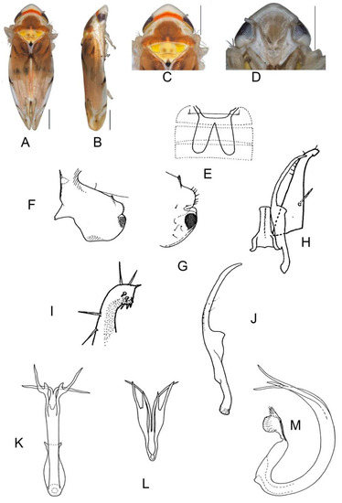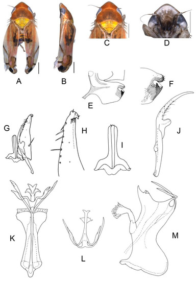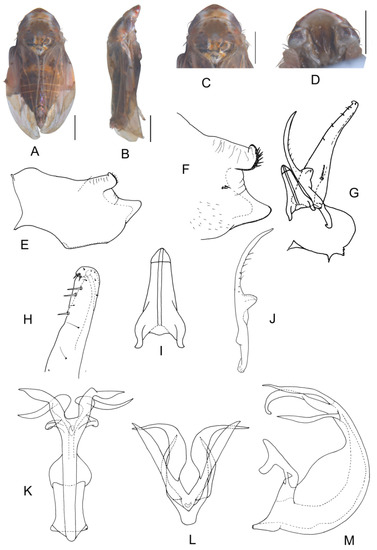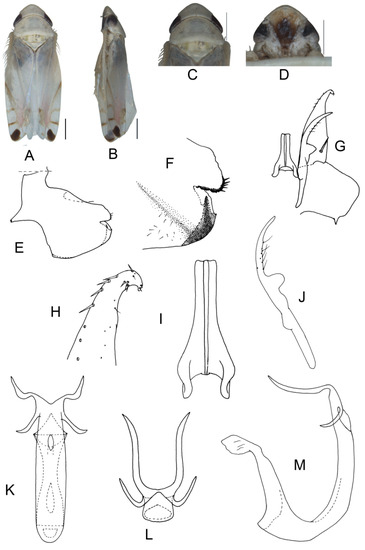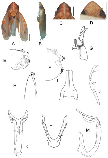 Eurhadina (Singhardina) jarrayi rec. nov. (E–M: Dworakowska, 2002 [3]): (A) habitus, dorsal view; (B) habitus, lateral view; (C) head and thorax, dorsal view; (D) face; (E) head and thorax, dorsal view; (F) forewing; (G) abdominal apodemes, dorsal view; (H) pygofer side, lateral view; (I) subgenital plate, connective and paramere, dorsal view; (J) paramere, dorsal view; (K) aedeagus, posterior view; (L) apex of aedeagal shaft, dorsal view; and (M) aedeagus, lateral view. Scale bars: 0.5 mm.