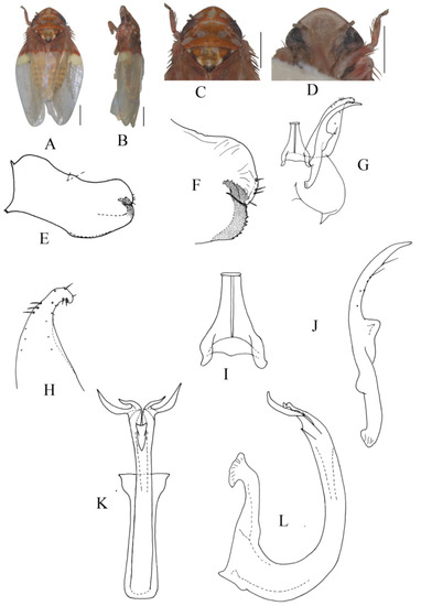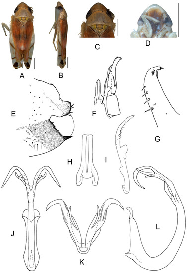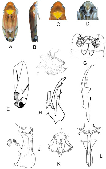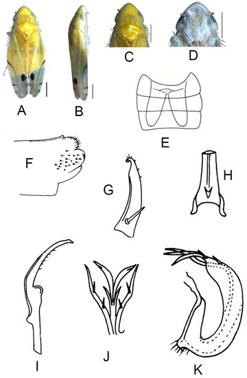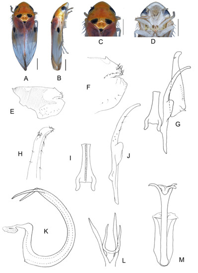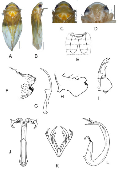 - Zhang, Y.L. A Taxonomic Study of Chinese Cicadellidae (Homoptera), 1st ed.; Tianze Eldonejo: Xianyang, China, 1990; p. 218. (In Chinese) [Google Scholar]
