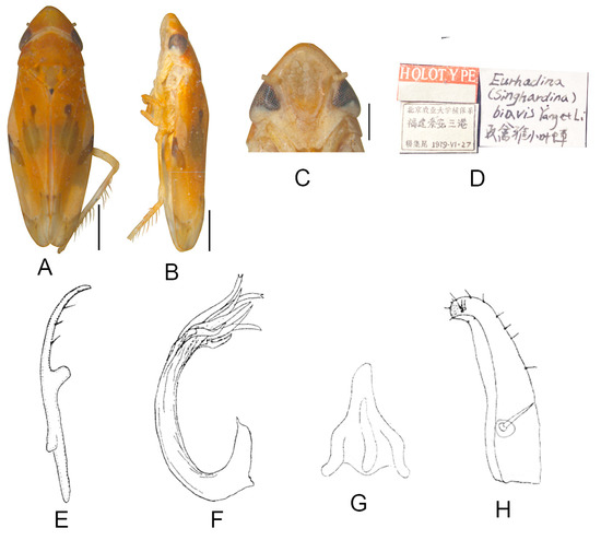 - Zhou, J.; Zhang, Y.L.; Huang, M. First records of the Oriental Eurhadina (Singhardina) robusta species group from China with descriptions of five new species (Hemiptera: Cicadellidae: Typhlocybinae). Zootaxa 2021, 5061, 510–522. [Google Scholar] [CrossRef] [PubMed]
