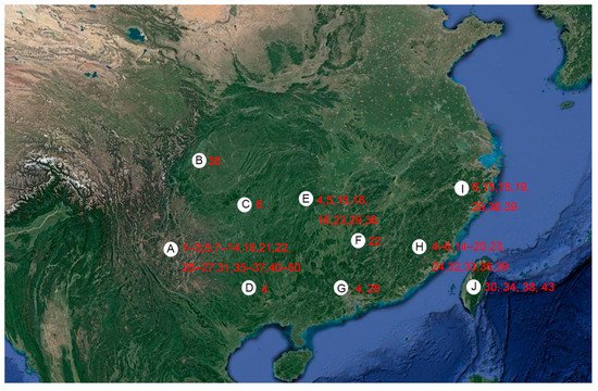 Geographical distribution of Singhardina species in China. As shown in the figure: (A) Yunnan Prov., (B) Sichuan Prov., (C) Guizhou Prov., (D) Guangxi Prov., (E) Hunan Prov., (F) Jiangxi Prov., (G) Guangdong Prov., (H) Fujian Prov., (I) Zhejiang Prov., (J) Taiwan Prov.; (1) E. (S.) foliiformis sp. nov., (2) E. (S.) galacta sp. nov., (3) E. (S.) menglunensis, (4) E. (S.) recta sp. nov., (5) E. (S.) rubra, (6) E. (S.) rubrocorona, (7) E. (S.) scalesa sp. nov., (8) E. (S.) scamba sp. nov., (9) E. (S.) scandens sp. nov., (10) E. (S.) unipunctata, (11) amacularis sp. nov., (12) E. (S.) parilintanonica sp. nov., (13) E. (S.) anurous, (14) E. (S.) biavis, (15) E. (S.) centralis, (16) E. (S.) choui, (17) E. (S.) cuii, (18) E. (S.) dazhulana, (19) E. (S.) diplopunctata, (20) E. (S.) exclamationis, (21) E. (S.) extensa sp. nov., (22) E. (S.) fasciata rec. nov., (23) E. (S.) flavicorona, (24) E. (S.) flaviscutella sp. nov., (25) E. (S.) fusca, (26) E. (S.) gracilifurca sp. nov., (27) E. (S.) lata sp. nov., (28) E. (S.) nasti, (29) E. (S.) rubrania, (30) E. (S.) rubrivittata, (31) E. (S.) rutilans, (32) E. (S.) spinifera, (33) E. (S.) tripunctata, (34) E. (S.) unilobata, (35) E. (S.) uprotrusa sp. nov., (36) E. (S.) wuyiana, (37) E. (S.) zadyma rec. nov., (38) E. (S.) acapitata, (39) E. (S.) flavistriata, (40) E. (S.) jarrayi rec. nov., (41) E. (S.) prima rec. nov., (42) E. (S.) quadrimacularis sp. nov., (43) E. (S.) yingfengica, (44) E. (S.) dissimilis, (45) E. (S.) flatilis, (46) E. (S.) fumosa, (47) E. (S.) furca, (48) E. (S.) immatura, (49) E. (S.) krispinilla, and (50) E. (S.) pookiewica.