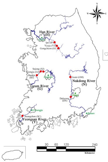 Chironomid larvae inhabit the most organically rich sediments of large rivers and are crucial benthic macroinvertebrates for biomonitoring rivers that supply freshwater resources to large cities or metropolises. In South Korea, these rivers include the nation’s four main large rivers: the Han River (Seoul: population 9.6 million), Geum River (Daejeon: 1.5 million), Yeongsan River (Gwangju: 1.4 million), and Nakdong River (Busan: 3.3 million; Daegu: 2.3 million) [14] (Figure 1).