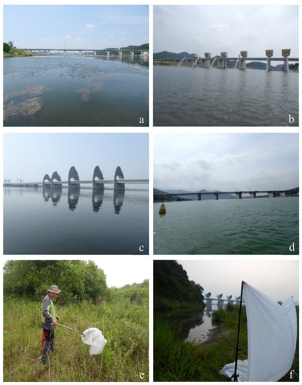 Chironomid sampling sites and collection methods. (a) Han River at Ipo weir; (b) Geum River at Sejong weir; (c) Yeongsan River at Seungchon weir; (d) Nakdong River at Danlseong weir; (e) sweeping along Han River at Ipo weir; (f) light-tarping along Yeongsan River at Seungchon weir.
