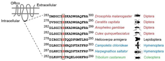 Conservation of the S289 phosphorylation site of Orco across different insect species. The amino acid sequences of Orco were downloaded from the National Center for Biotechnology Information (NCBI): flies D. melanogaster (NP_524235.2) and Ceratitis capitata (NP_001266301.1); mosquitoes Anopheles gambiae (XP_041762121.1) and Culex quinquefasciatus (ABB29301.1); moth Helicoverpa armigera (ADQ13177.1); parasitoid Campoletis chlorideae (AKO69815.1); ant: Harpegnathos saltator (XP_011139767.1); beetle Tribolium castaneum (CAM84014.1).