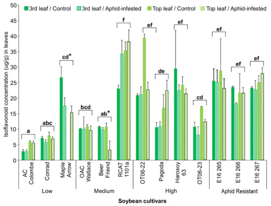 Mean isoflavonoid concentrations (µg/g; ±S.E.) in combined top three trifoliate leaves with and without aphids of 11 soybean cultivars after 4 weeks growth under greenhouse conditions. Bars with the same lowercase letters indicate no significant difference (p > 0.05) for the isoflavonoid concentrations between those cultivars. Bars with an asterisk (*) indicate a significant difference (p < 0.05) between the control and aphid-infested leaves for that cultivar.