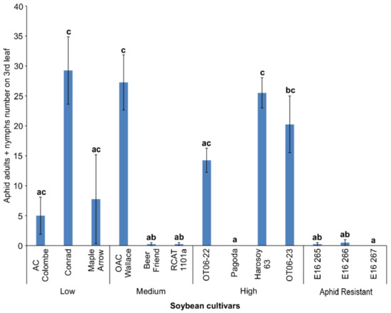 Soybean (Glycine max. L Merr) is an important field crop in southern Canada, and has been grown in Ontario for over 70 years. In 2019, the amount of soybean acreage planted was greater than 3.1 M acres in Canada with over half (1.6 M acres) in southwestern Ontario [1], where yields of 45 to 52 bushels per acre were reported and 1.7 to 2.1 M tonnes were produced. Most of the soybean produced is glyphosate tolerant (75%) and used for oil and animal feed, while the remainder is non-GMO and is grown for food and organic production [2]. In southwestern Ontario, the maturity groups range from MG I to MG III, and the cultivars are selected by their performance in field trials that also consider disease and pest resistance. One of the most damaging insect pests of Ontario soybean is the soybean aphid (Aphis glycines Matsumura; Hempitera: Aphididae), an invasive species that became established in 2000. The yield loss caused by soybean aphid is greatest in the R1–R2 stages, when flowers can abort and impact pod establishment. Beyond the R3 stage, damage can result in a smaller seed size and a reduction in seed quality [2]. The current strategy for A. glycines management involves monitoring and reacting by applying insecticides to reduce the aphid pressure. Insecticides are applied to control high populations of aphids; however, the over-use of insecticides has a negative impact on native enemies, such as ladybird beetles. Another integrated pest management (IPM) strategy is the use of host plant resistance, which is a heritable decrease in plant susceptibility to the pest [3]. Reducing the number of insecticide sprays or delaying applications until later in the growing season by slowing aphid population growth is the goal of using more resistant soybean cultivars.