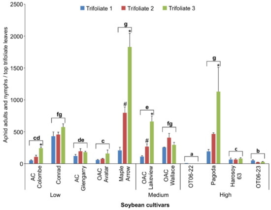 Mean aphid counts (±S.E.) on top 3 trifoliate leaves for 11 soybean cultivars after 4 weeks growth in the greenhouse. Bars with the same lowercase letters indicate no significant difference (p > 0.05) for the average aphid counts between those cultivars. Bars with an asterisk (*) or hashtag (#) indicate a significant difference (p < 0.05) between the number of aphids on the 1st and 3rd or 1st and 2nd trifoliate leaves, respectively.