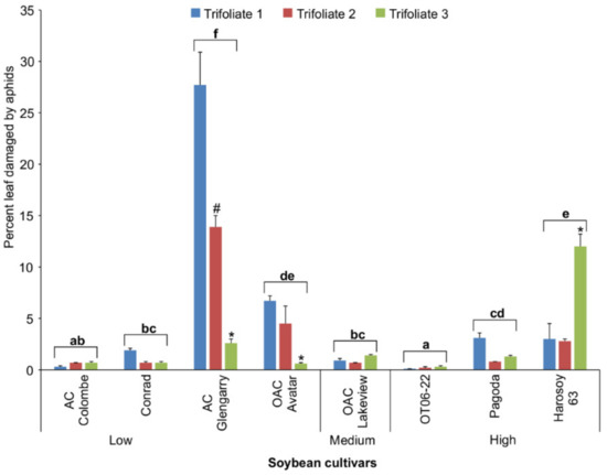 Mean percent damage (±S.E.) by soybean aphids to the top 3 trifoliate leaves for 8 soybean cultivars after 4 weeks growth in the greenhouse. Bars with the same lowercase letters indicate no significant difference (p > 0.05) for mean percent leaf damage between those cultivars. Bars with a hashtag (#) or asterisk (*) indicate a significant difference (p < 0.05) between the percent damage on the 2nd versus the 1st and 3rd, or the 3rd leaf versus the 1st and 2nd trifoliate leaves, respectively.