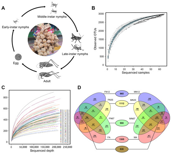 Changes in bacterial community diversity across life stages of Gampsocleis gratiosa. (A) Overview of development stages of Gampsocleis gratiosa, (B) species accumulation curves, (C) rarefaction analysis for each sample, (D) Venn diagram of OTU distribution.