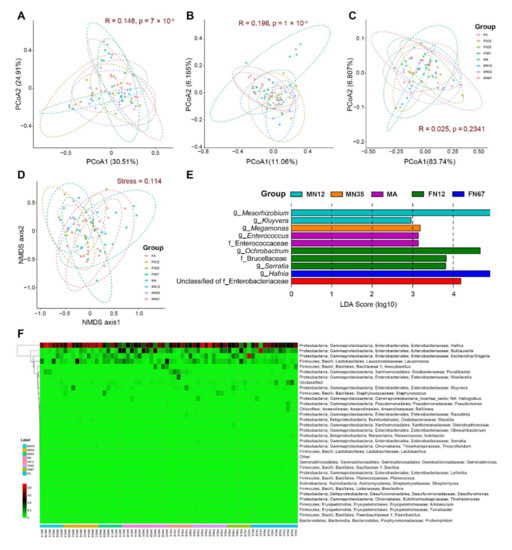 Analysis of similarity (ANOSIM) at the OTU level based on Bray-Curtis dissimilarity showed an overall significant difference among developmental stages and sexes (R = 0.148, p = 7 × 10−4). To better visualize the results, both PCoA and NMDS analyses based on the Bray-Curtis dissimilarity was plotted. The PCoA analyses showed significant differences at the OTU level among groups using two comparisons (ANOSIM: p = 7 × 10−4 using the Bray-Curtis dissimilarity indices, and p = 1 × 10−4 using unweighted UniFrac distances); the comparison using weighted UniFrac distances was not significant (p = 0.2341) (Figure 3A–C). The NMDS analysis (Stress value = 0.09) failed to provide a clear clustering based on the developmental stages and sexes (Figure 3D). LEfSe analysis identified two families, seven genera, and an unclassified Enterobacteriaceae family to be significantly associated with different development stages and sexes. Kluyvera and Mesorhizobium were more abundant in the MN12 group. Megamonas was more abundant in the MN35 group. The Enterococcaceae family and Enterococcus were more abundant in the MA group. The Brucellaceae family, Serratia, and Ochrobactrum were more abundant in the FN12 group. Hafnia was more abundant in the FN67 group. The unclassified Enterobacteriaceae family was more abundant in the FA group (Figure 3E). To demonstrate differences in genus abundance profiles between samples, a heat map was generated with R using the pheatmap package. The relative abundance and distribution of gut bacteria communities at genus level was shown by the heat map (Figure 3F). There were no significant differences in the abundance of fecal bacteria at the genus level among the eight groups. Compared to the G. gratiosa nymph group, adults contain more unique OTUs (together constituting 12.2% and 16.5% OTUs in the MA and FA groups, respectively). Beta diversity was further characterized by OTUs shared between groups, revealing that 17.94% OTUs were shared among all eight groups (Figure 1D).