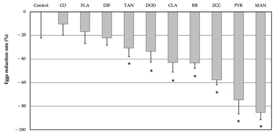 Eggs reduction rate (%) in treated olives compared to the control (set as zero). CO: copper oxychloride, FLA: flavonoids, DIF: difeconazole, TAN: tannins, DOD: dodine, CLA: clay, BB: B. bassiana, ZCC: zinc-copper-citric acid biocomplex, PYR: pyraclostrobin, MAN: mancozeb, compared to the control. * p < 0.05, significant differences compared to the control (negative binomial model). Bars indicate the negative standard error.