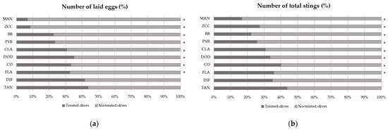 Effects of treatments on the preference for oviposition of B. oleae evaluated by counting (a) number of laid eggs (%) and (b) number of total stings (sterile stings plus stings with laid eggs) in treated and untreated olives. MAN: mancozeb, ZCC: zinc-copper-citric acid biocomplex, BB: B. bassiana, PYR: pyraclostrobin, CLA: clay, DOD: dodine, CO: copper oxychloride, FLA: flavonoids, DIF: difeconazole, TAN: tannins. The results are the summed values of thirty replicates in independent repeats. * p < 0.05, significant differences compared to the control (paired samples Wilcoxon test).