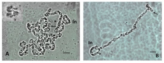 - Gaspar, V.P.; Borges, A.R.; Fernandes, M.A. NOR sites detected by Ag-DAPI staining of an unusual autosome chromosome of Bradysia hygida (Diptera: Sciaridae) colocalize with C-banded heterochromatic region. Genetica 2002, 114, 57. [Google Scholar] [CrossRef] [PubMed]