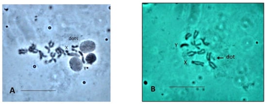 - Gold, J.R.; Ellison, J.R. Silver staining for nucleolar organizer regions of vertebrate chromosomes. Stain. Technol. 1983, 58, 51–55. [Google Scholar] [CrossRef]