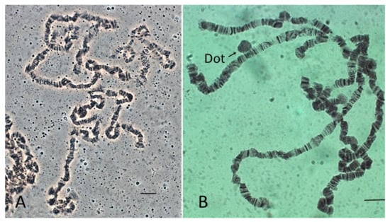 (A) Scaptodrosophila bryani polytene set. (B) Scaptodrosophila cancellata polytene set. Presumed ‘dot’ indicated. Bar = 10 µm.