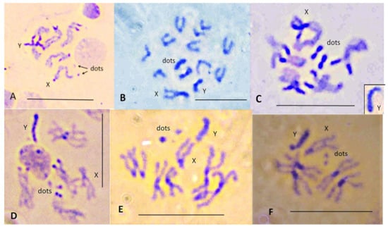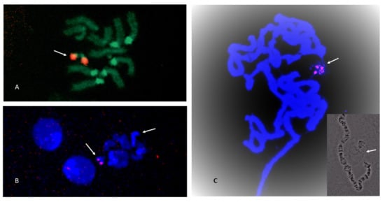 - Kavalcco, K.F.; Pazza, R. A rapid alternative technique for obtaining silver-positive patterns in chromosomes. Genet. Mol. Biol. 2004, 27, 196–198. [Google Scholar] [CrossRef] [Green Version]