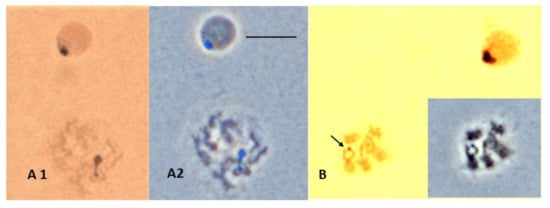 Attempts to identify the site of the active nucleolus in mitotic spreads using variations of the silver staining technique of Howell and Black [] were mostly unsuccessful. The only consistent silver staining was at the presumed nucleoli of interphase cells (Figure 7A1). Occasionally, a silver-stained nucleolus or fragment of a nucleolus could be seen attached to a prophase chromosome, but it was usually unclear which chromosome was involved (Figure 7A1). When staining occurred on metaphase chromosomes, it was usually at centromeres. Rarely, staining occurred at a chromosome region that we knew from FISH results contained rDNA (Figure 7B). Most mitoses did not show silver staining at all. Such variable results have also been observed in other species [,,].