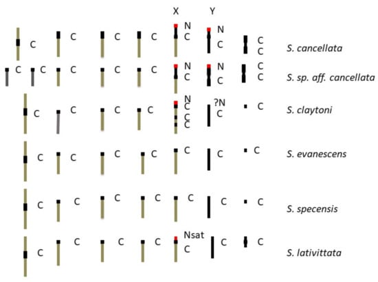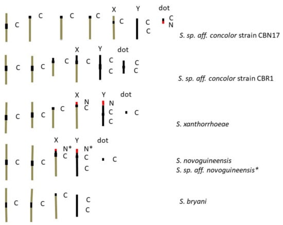 Ideograms of chromosomes examined. C = C-banded heterochromatic region; N = NOR location by FISH; ?N = possible NOR (FISH not conducted for male); Nsat = NOR identified by satellite location; N* = FISH conducted for S. sp aff. novoguineensis.
