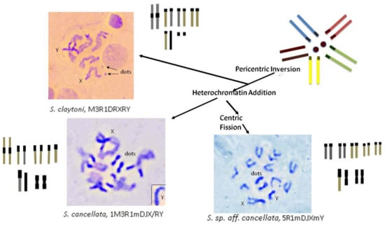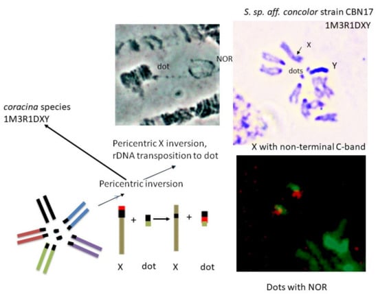 The most common karyotype among the species that we have examined is one pair of metacentrics and three pairs of acrocentric autosomes, acrocentric or submetacentric sex chromosomes and ‘dot’ chromosomes of varying sizes. This karyotype is found in all except one member of the coracina group species and also in S. sp. aff. concolor strain CBN17. It can be derived from the primitive karyotype by postulating a pericentric inversion in an acrocentric autosome that moved the centromere to a central position, pericentric inversions and heterochromatin amplification in some of the sex chromosomes and heterochromatin amplification in ‘dot’ chromosomes (Figure 9). The exceptional karyotype among the coracina species is S. sp. aff. cancellata, which has five pairs of acrocentric autosomes, submetacentric sex chromosomes and large metacentric ‘dot’ chromosomes. This karyotype could have been obtained by dissociation of the metacentric autosome into two acrocentrics. Heterochromatin changes are very similar to those in S. cancellata. Since other members of the coracina group have an acrocentric X [], and in S. claytoni, the NOR is associated with centromeric heterochromatin, it is most probable that the heterochromatic arm of the X developed through extension of heterochromatin between the centromere and the NOR, leaving the NOR positioned near its end. Changes in the length of ‘dot’ chromosomes were common in the coracina species examined by Bock [] (Figure 1, Figure 2, Figure 3, Figure 4, Figure 5 and Figure 6).