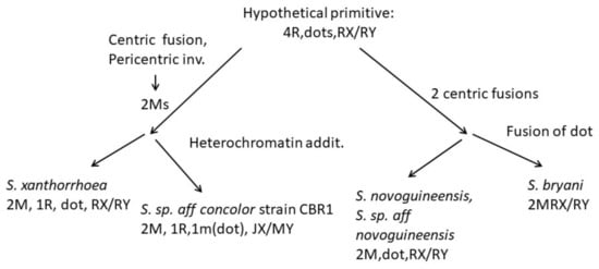 Further arm reduction is observed in S. novoguineensis and S. sp. aff. novoguineensis, both having karyotypes composed of two pairs of metacentrics, a pair of dots and an acrocentric X chromosome. The most straightforward manner that these changes could have evolved from a 5R, 1D karyotype is for two centric fusions to have occurred between four pairs of autosomes (Figure 11). Finally, S. bryani has lost the ‘dot’ chromosome, most likely by fusion with one of the longer chromosome arms. The absence of a ‘dot’ chromosome has been observed in several Drosophila species groups. In D. busckii [], a basal Drosophila species, ‘dot’ chromosome genes are located near the heterochromatin of the X chromosome and also at a homologous region of the Y chromosome []. In situ hybridization also placed ‘dot’ chromosome genes of D. lebanonensis near the centromere of the acrocentric X chromosome (A element) []. Since X and ‘dot’ chromosomes have some similar characteristics, it has been suggested that, in the ancient history of drosophilids, the ‘dot’ chromosome (F element) was part of the X chromosome []. In fact, sequencing and mapping of non-Drosophila Diptera have shown that the Mueller A element is an autosome and the ‘dot’ chromosome is the female sex chromosome in these outgroup species []. Based on these results, we might hypothesize that ‘dot’ genes would be translocated near the centromere of the X chromosome in S. bryani. However, in six species of the willistoni species group, ‘dot’ chromosome genes were located near the centromere of the E element, also acrocentric []. Since the X and Y are the only acrocentrics in S. bryani, it seems likely that the F element would be translocated to the X chromosome in this species. However, confirmation of this and other arm translocations will only come from future in situ hybridizations.