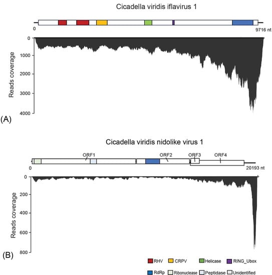 Genomic structure and RNA-seq read coverage of Cicadella viridis iflavirus 1 (A) and Cicadella viridis nido-like virus 1 (B). The boxes represent the open reading frames (ORFs) of each virus. Conserved functional domains are color-coded and their corresponding names are indicated at the bottom of the figure. Abbreviation of the conserved domain names: RHV, picornavirus capsid protein domains; CRPV, cricket paralysis virus capsid superfamily domain; RdRp, RNA-dependent RNA polymerase domain.