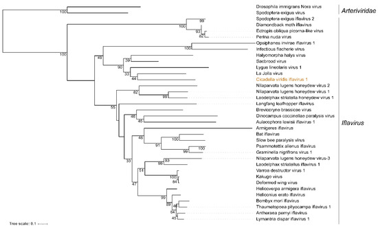 Insects are the largest group of organisms on earth, and insect virus resources are an essential part of natural resources. Previously, most insect viruses were discovered due to their pathogenic effects on their hosts or because they caused diseases [1,2]. However, the emergence in recent decades of metagenomic/metatranscriptomic next-generation sequencing and bioinformatics analysis has made it possible to conduct de novo sequencing and assemble numerous novel RNA viruses from non-pathogenic insects [3,4,5,6,7]. These viruses are generally referred to as insect-specific viruses (ISVs), which exclusively replicate in their insect hosts, and transovarially or vertically transmit within a population [8]. ISVs are considered as promising agents for the biological control of specific insects and the pathogens they transmit, gaining them increasing attention [9,10]. Comprehensive analysis of ISVs has been carried out on mosquitos, ticks, and other medically important hematophagous insects [11,12]. Phylogenetic analysis demonstrates that the majority of identified ISVs belong to the particular virus taxa, including Ascoviridae, Baculoviridae, Bunyaviridae (now Bunyavirales), Flaviviridae, Parvoviridae, Rhabdoviridae, Togaviridae, and novel groups as yet unclassified [13].