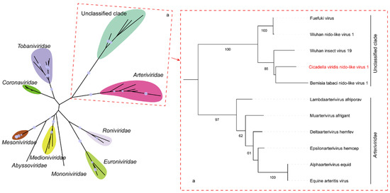 Phylogenetic analysis of Cicadella viridis nido-like virus 1 (CvNiLV1) with other nidoviruses. Maximum likelihood phylogenetic tree based on the RNA-dependent RNA polymerase was constructed with a bootstrap of 1000. A taxonomic overview of viruses at order Nidovirales are shown on the left, and a close-up view of two interested clades are shown in the dotted frames on the right.