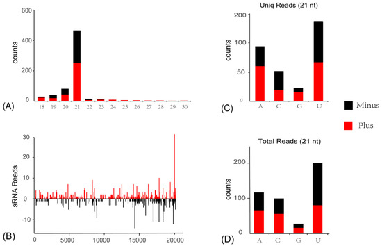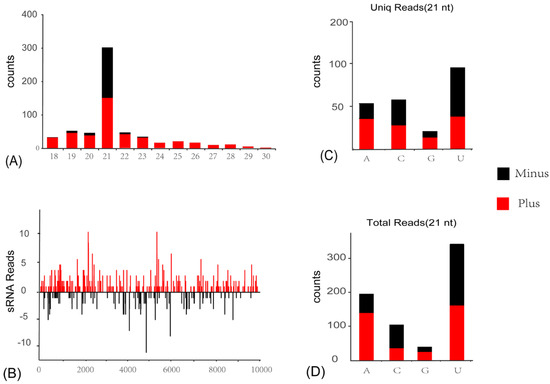 To identify the siRNAs derived from the two viruses, the 18–30 nt long quality trimmed sRNA reads were extracted and collapsed using the FASTX-Toolkit (http://hannonlab.cshl.edu/fastx_toolkit/) accessed on 1 May 2021. Later, the processed reads were mapped back to the assembled full viral genome sequence using Bowtie with zero mismatches, and the output virus-derived siRNAs (vsiRNAs) were further calculated with custom perl script and the Linux bash scripts [27].