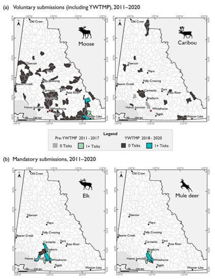 - Milligan, H. Licensed Harvest Trends in Yukon: 1980 To 2014; Yukon Fish and Wildlife Branch Report MR-18-05; Department of Environment, Government of Yukon: Whitehorse, YT, Canada, 2018.