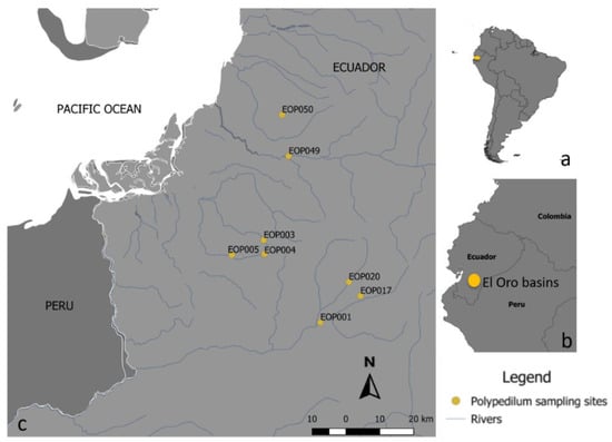 Study sites: (a) sites in relation to South America; (b) site distribution in Ecuador; and (c) study sites in El Oro Province. B1: Arenillas basin (EOP003, EOP004, EOP005); B2: Puyango basin (EOP001, EOP017, EOP020); B3: Jubones basin (EOP049); B4: Siete river basin (EOP050).